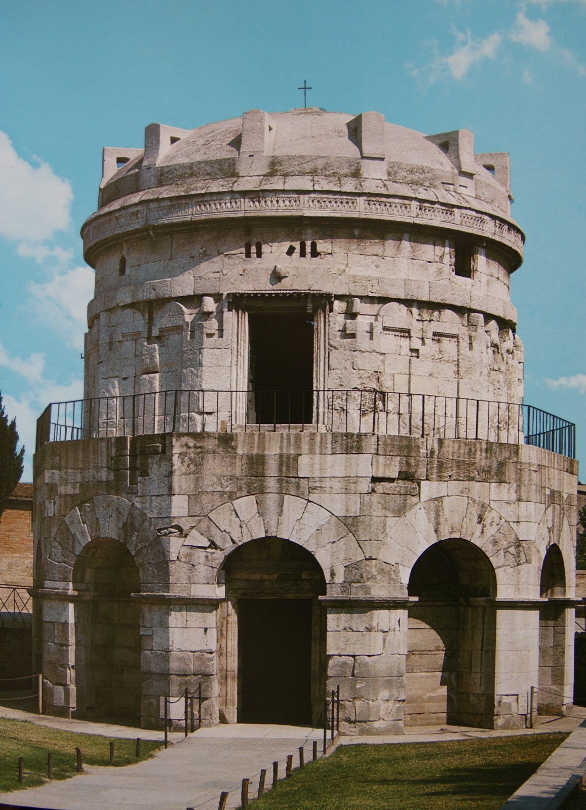Tato významná historická postava žila v letech 453 až 526 a dvoupodlažní mauzolem z bílého istrijského mramoru si nechala postavit již v roce 520. Horní část stavby je zakončena velkým monolitickým blokem se jmény osmi apoštolů a čtyř evangelistů. Podle posledních měření má 10,76 metrů v průměru, 3,09 metrů na výšku a váží 230 tun. Pod touto kopulí se nacházela kaple. Vnější schodiště zavede návštěvníky do patra, ve kterém se nachází porfyrová vana, ve které byl pravděpodobně pohřben Theoderic. Jeho ostatky byly z mauzolea odstraněny a to bylo následně přeměněno na ortodoxní modlitebnu. Interiér horní části mauzolea má tvar kříže. Bílou stavbu zdobí jen obloukové výklenky, slepé arkády, vlysy a vrcholový kříž.