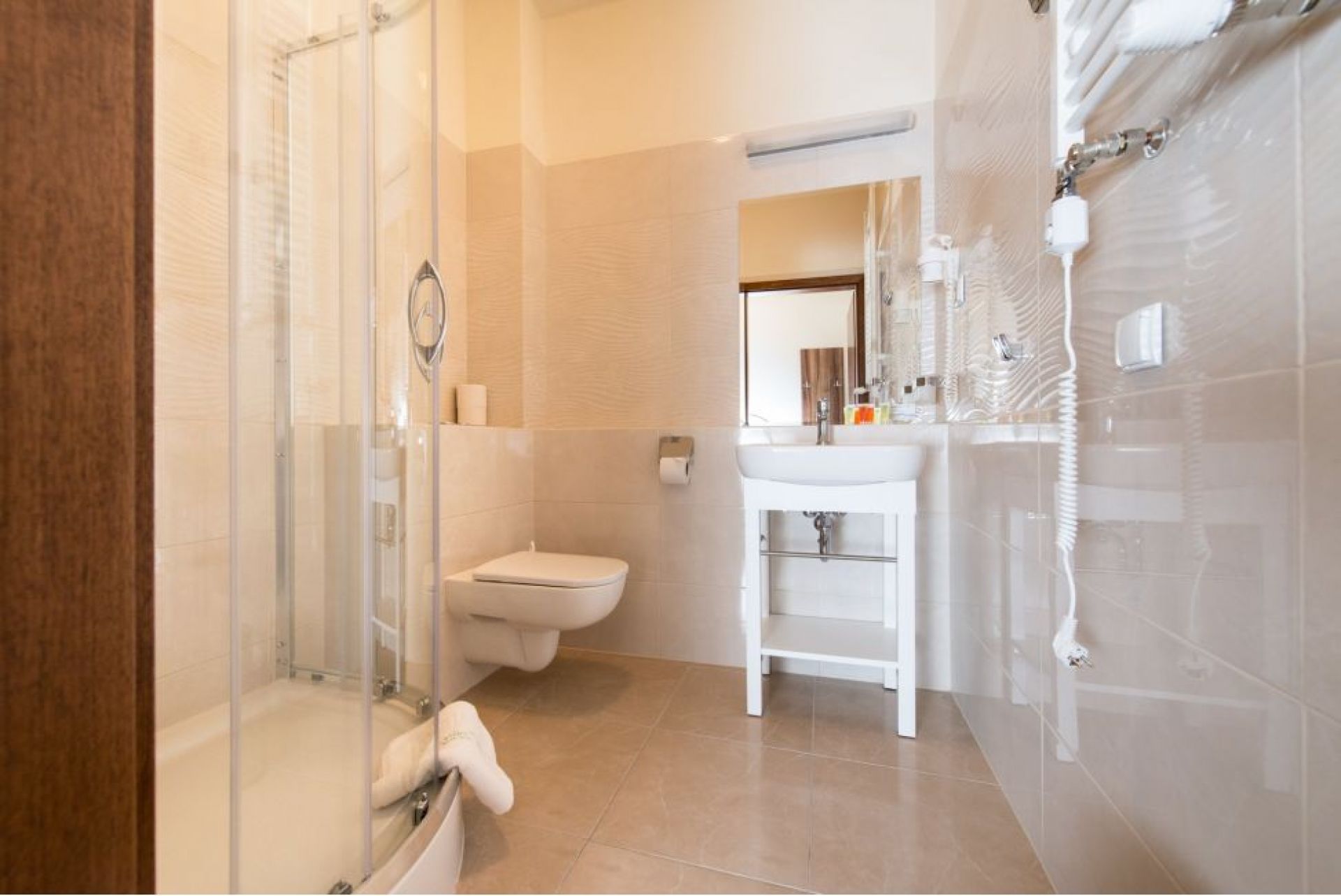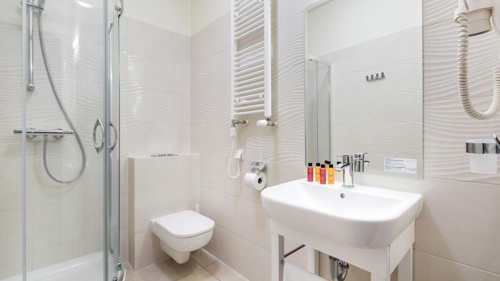 koupelnové vybavení včetně ručníků, kosmetiky, županu a fénu.
