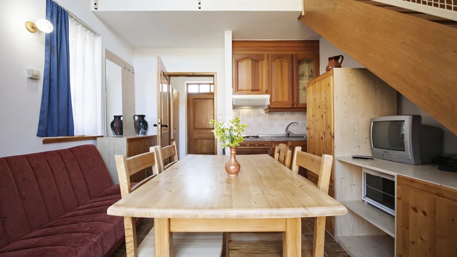 Ubytování ve dvoulůžkových apartmánech s vlastním sociálním zařízením (sprcha, WC, fén) se skládají z ložnice a obývacího pokoje s plně vybaveným kuchyňským koutem.