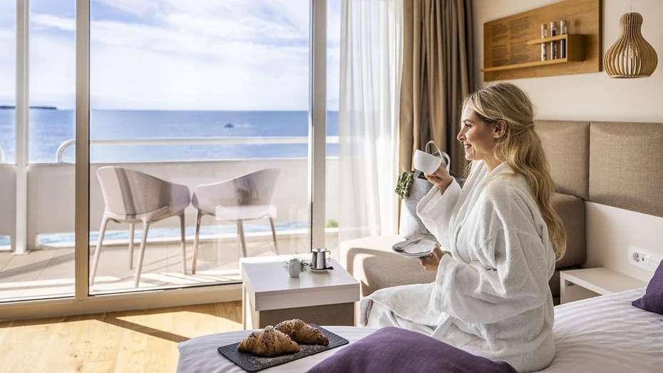 pokojích s vlastním balkonem, odkud se otevírá výhled na moře nebo na